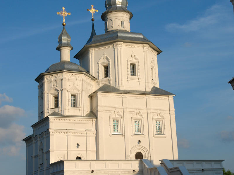 Восьмерики восточного и центрального верха отличались особой органичностью, близостью по силуэту к завершениям деревянных храмов. Башни постепенно вырастали из широко раскинувшихся открытых двухъярусных арочных галерей с примыкавшим с севера невысоким придельным храмам. Сохранившиеся кокошники четверика были переделаны в фигурные фронтоны-аттики[7], подобные тем, которые мы увидим на Нарышкинских храмах Москвы в 80–90 гг. XVII ст. Наличники оконных проемов, устроенных в 1636 г., намного сложней чем в Стародубе. В полуколонках появились перехваты – дыньки, обрамленные орнаментированными поясками, их поддерживают многообломные кронштейны, намного сложней стал рисунок тимпанов с разорванными фронтонами и гирькой. На гранях восьмерика робко появляются пучки спаренных полуколонок. При строительстве собора применено более 20 видов лекального кирпича.
