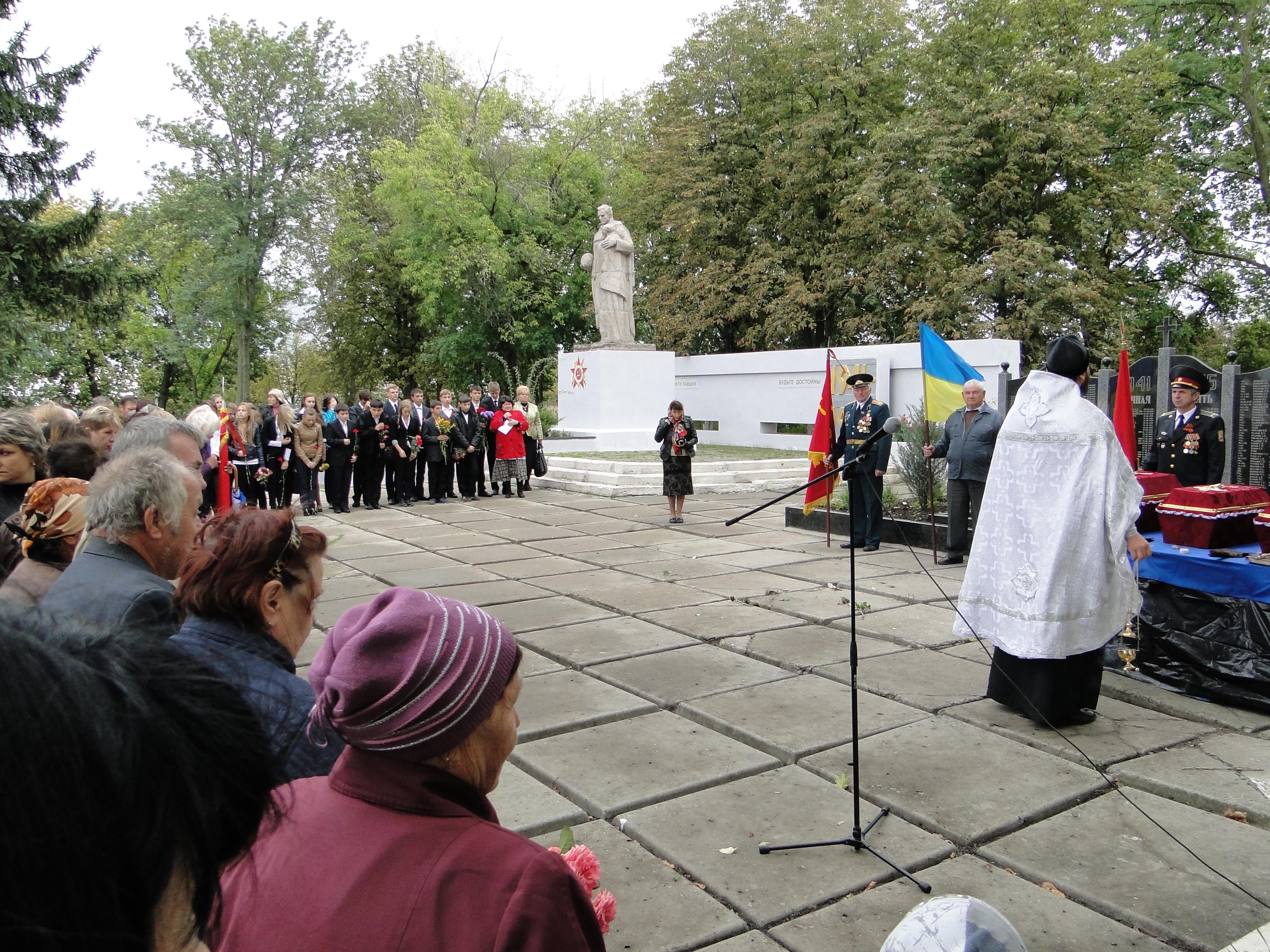 Перезахоронение состоялось 5 сентября, было все: школьники с цветами, ветераны, представители власти, телевиденье, салют, местный батюшка отец Олег. Все выглядело достойно и немного по-советски с оттенками перестройки. Поразили, конечно, школьники, своим духовным воспитанием и поведением во время отпевания, словно они были в храме! Но хотелось нечто большего! Не эстафеты передачи знамени Победы от старшего поколения младшему, хотя мальчик и колено преклонил и знамя поцеловал. Чего именно я не знаю, но ведь 22 года стране, а современного ритуала, и инструкции для представителей власти, ответственных чиновников, как не было, так и нет. Все решается только энтузиастами, которых намеренно, или случайно находит местная власть. В такой стране жить тошно! Особенно когда осознаешь свои силы, возможности и желания. И если бы руководство Харьковской области реально бы хотело изменить ситуацию к лучшему, оно бы уже давно могло кардинально изменить ситуацию с братскими могилами, внести большую часть имен захороненных, а обнаруженных воинов хоронить не безымянными. Неужели непонятно, что еще немного и ситуация будет необратимой!
