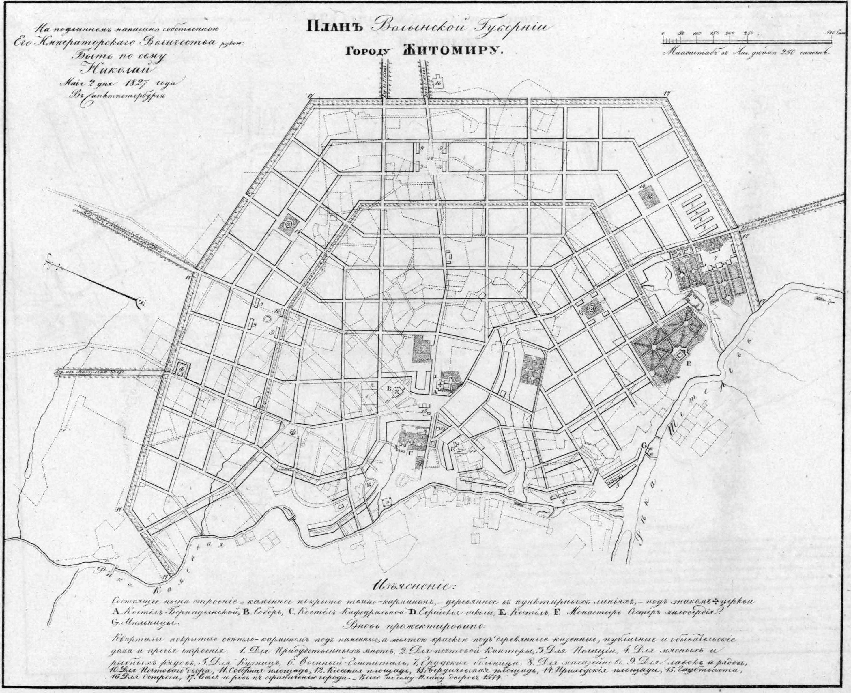 - 1840 год. Об оставлены Житомира главным городом Волынской губернии. Главный город Волынской губернии, Житомир, некогда частное владение Графов Ильинских (Житомир приобретен в казну в 1802 году), занимает ныне, без сомнения, первое место между всеми городами сей губернии, по своему устройству, населению и состоянию промышленности. В 1838 году считалось в нём жителей 20626 душ обоего пола, и в том числе купцов 207; земли под заселением находится 785 десятины, под выгоном 2056, под лесом 1527; число домов простирается до 1195, между коими 59 каменных; церквей и молитвенных домов считается: каменных 7, деревянных 23; лавок 259; улиц больших, который все прямые, широкие и вымощенные, 7; из малых улиц — мощенных 11, не мощенных 15; площадей 4, учебных и богоугодных заведений также 4, заводов и фабрик 14, ярмонок 3.