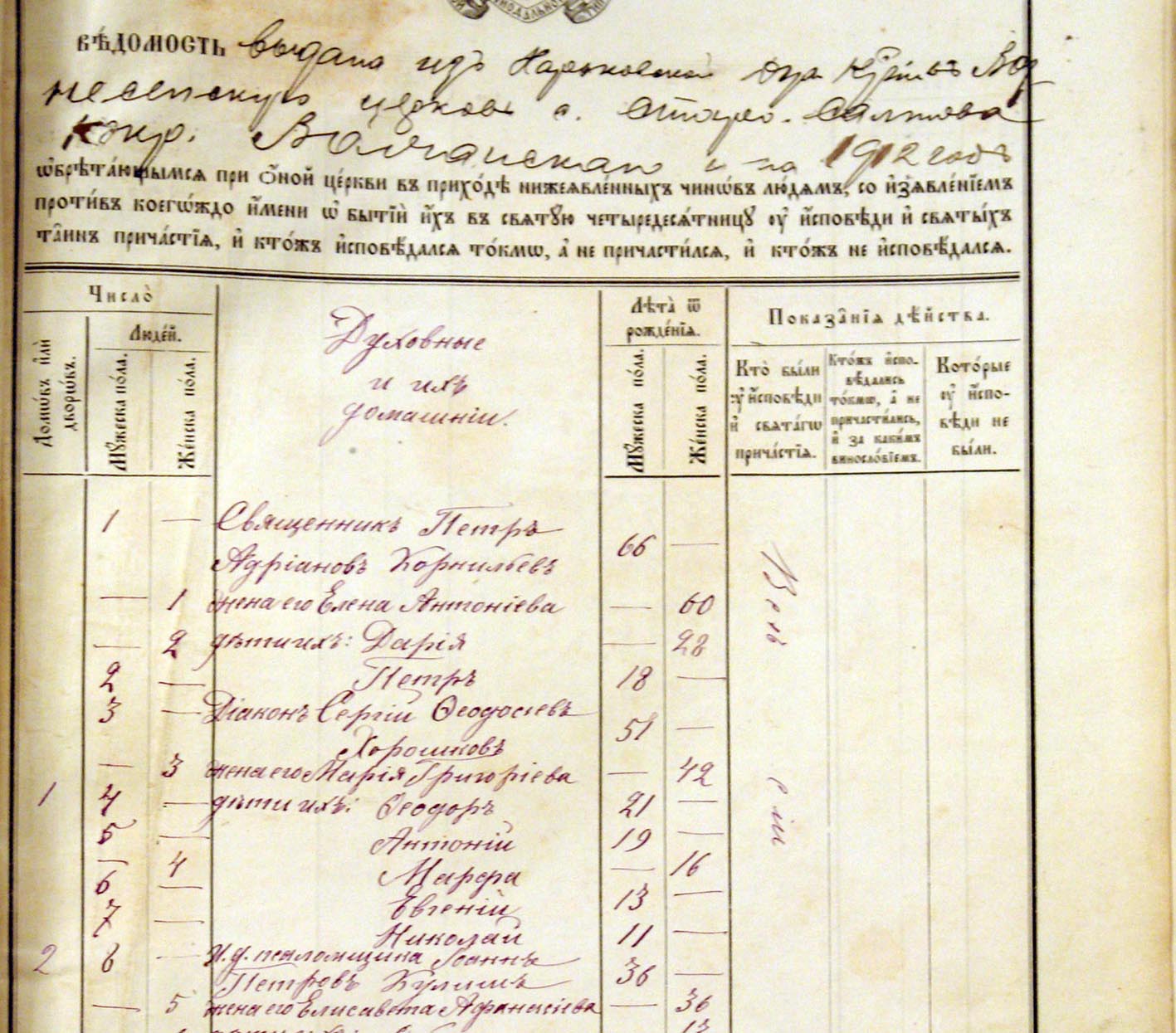ВЕДОМОСТЬ выдана из Харьковской духовной консистории в Вознесенскую церковь с. Старый Салтов Волчанского уезда на 1912 год обретающимся при оной церкви в приходе нижеобъявленных чинов людьми, со изъявлением против каждого имени в бытии их в святую четыредесятницу у исповеди и святых тайн причастия, и кто ж исповедался токмо, а не причастился, и кто ж не исповедался
