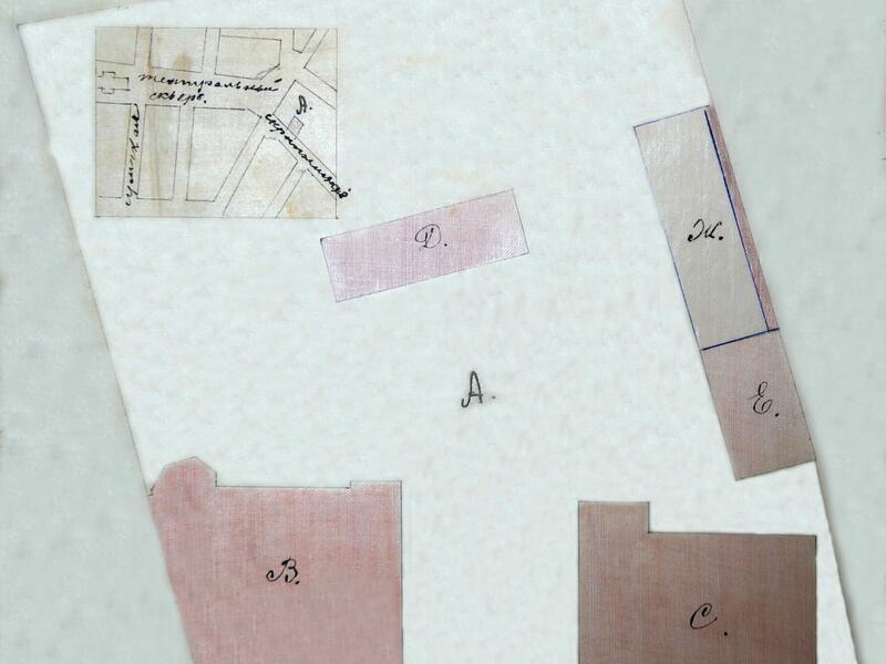 На план дворового місця показані: В - передбачуваний для будівництва будинок; С - старий дерев'яний будинок обкладений цеглою та критий залізом; Д - двоповерховий кам'яний будинок критий залізом; Е, Ж - дерев'яні служби криті залізом.