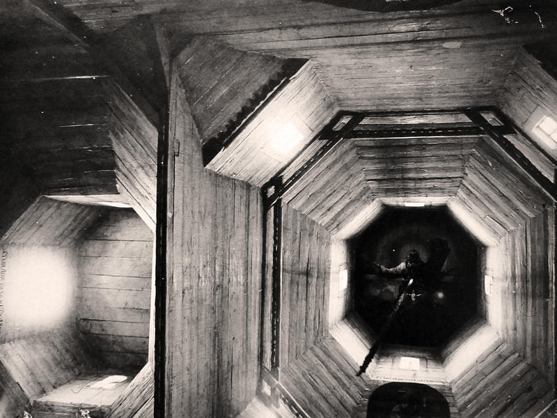 Верхні вінці зрубу стін центральної дільниці в інтер’єрі зміцнює і позначає межу зрубу стін і першого залому суцільний пояс ригелів з різьбленою лиштовкою. Такими ж різьбленими брусками-ригелями позначені внизу вузькі грані восьмигранної частини того ж зрубу.