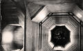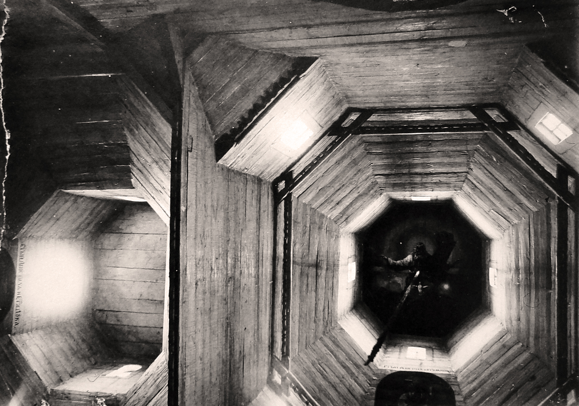 На рівні, де починаються восьмерики рукавів, чотиригранний зруб центра переходить у восьмигранний. Притому довжина і ширина його залишається ті самі, і грані, орієнтовані по сторонах світу, продовжують безпосередньо грані чотиригранника. В коротших (південно-західній та аналогічних їй) гранях восьмигранника прорізано по вікну. Перший залом центральної дільниці починається приблизно на рівні початку другого залому рукавів. Він переводив об’єм дільниці у світловий восьмерик, площею близький до площі восьмерика бабинця, але вищий і стрункіший.